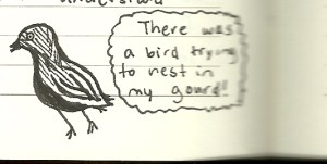 I noticed the other day that there was some rattling on my porch. So I investigated and found a small finch flying away, and my gourd shaking wildly. I guess someone is trying to nest. However, the gourd is too close for comfort for the little thing. I think it would rather have a nest in a tree. I mean, that would probably be the most ideal place.