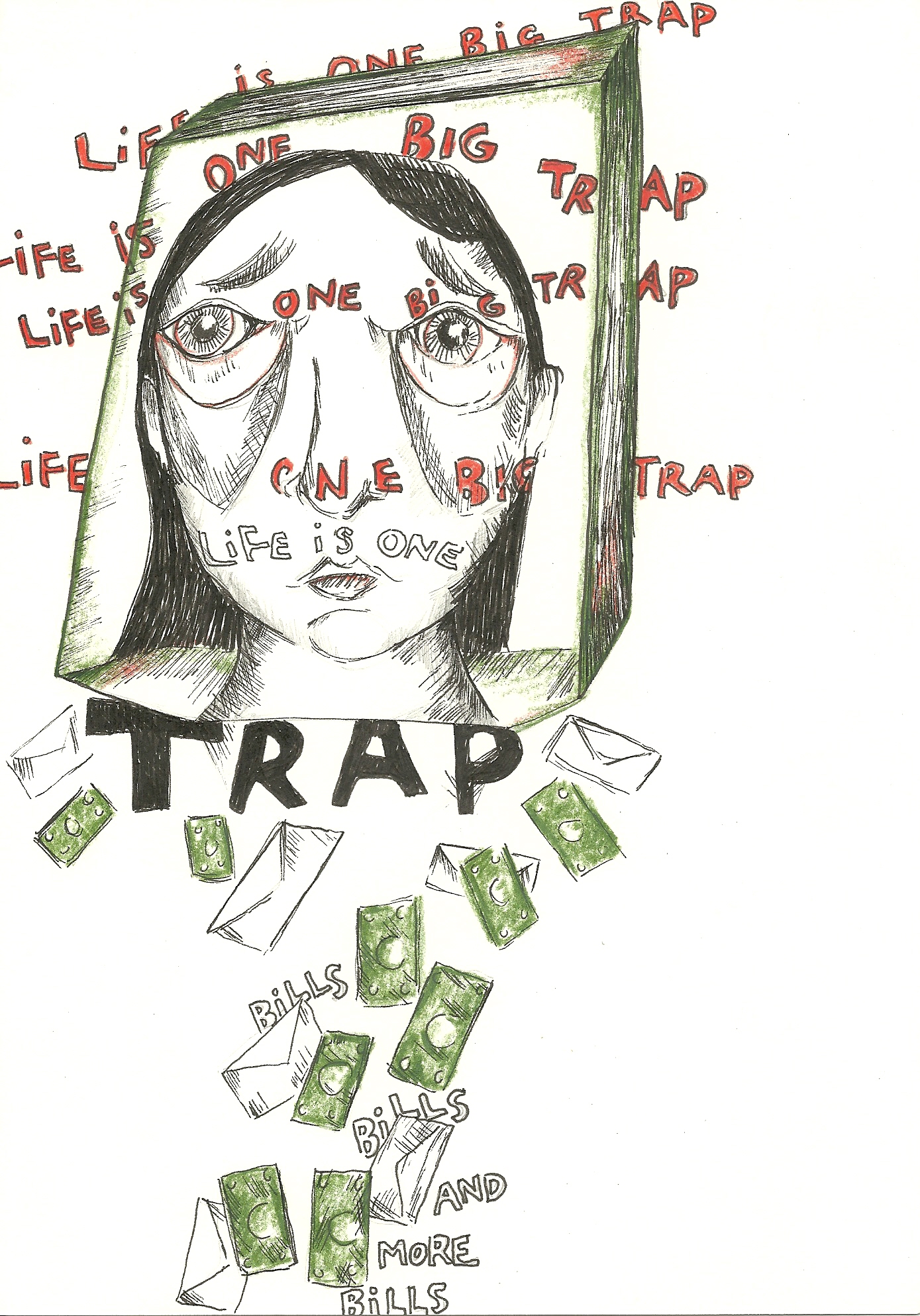 I’m pretty sure the general population is feeling this way these days. More so than others, but I drew this last summer when I was stuck worrying about whether I would have enough money to pay for all the bills I had. Student loans up the wazoo, maxed out credit cards…here I was looking at myself in my 20’s and felt like my credit determined my life here–would I ever be able to afford a car? A house someday? Go back to school for my masters degree? All the while, my boyfriend had to get a second job just to help me pay for my bills. And I have a 40 hour a week job, but