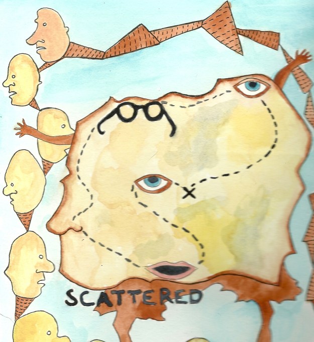 I just felt that most of us, at one point or another have felt scattered. Sometimes we need directions to help us find all of us and to feel whole again. I tried to make it look like a map. The faces that are all connected are just a way to show that universally we have all felt this way some time or another. And it helps to have someone along the way. Hope you like it. I think that I will try to make a better looking one using this same idea. Enjoy!