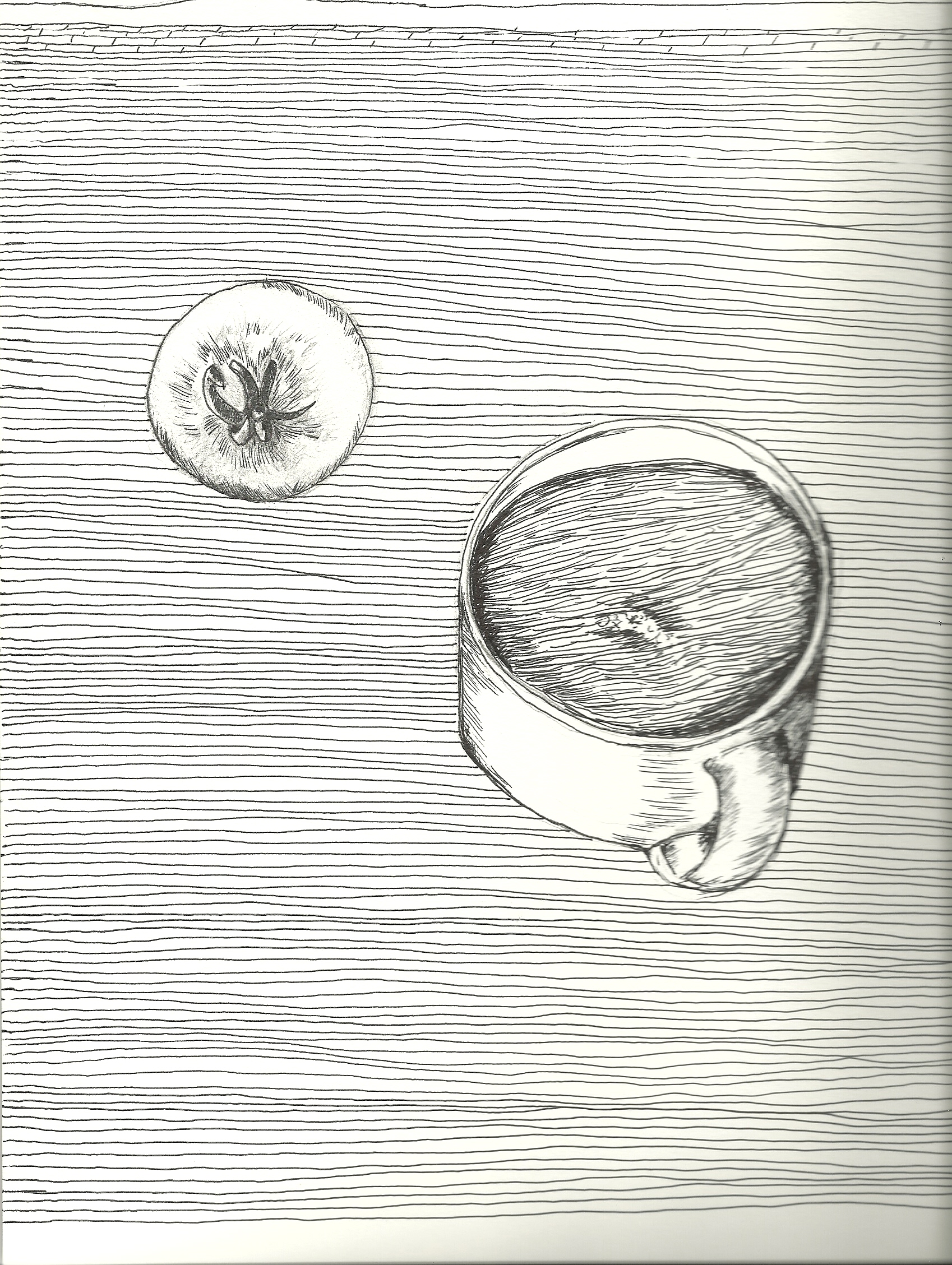 The tomato came from my very own tomato plant and it’s just about to turn red ( I pick them early because I have some pesky birds that will try to eat them if I don’t pick it early enough). I guess green tomatoes are bitter and so is black coffee…that would be the only correlation with the two (that and they come from some kind of plant). How do I turn those into a meditation practice? Well, I didn’t, I just turned it into an opportunity to draw!
