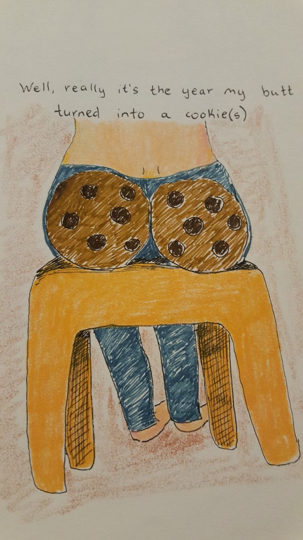 It happens. We turn a year older. and so do our butts… because our butts are separate entities… which have revolved and evolved into the shapes of two ginormous cookies. i knew it. i spent all christmas and winter baking cookies for my kids. my husband kept requesting my cookies because it’s cheaper than store bought and so much better. add beer, pizza, easter candy and other junk to the butt batter and wahoop! cookie butt. happy birthday to my cookie butt. i’ll be sure to light a candle to my ass and wish it a merry christmas i mean happy birthday. 35 years of making and creating this great big cookie butt!
