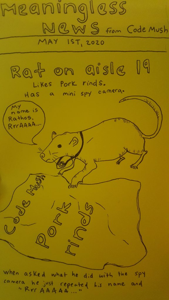 Rathos has been seen roaming around aisle 19 with a bag of pork rinds and a pork belly to boot. With his little spy camera, I wonder just what is he really up to? Maybe we’ll find out in the next instalment of Code Mush Meaningless News.