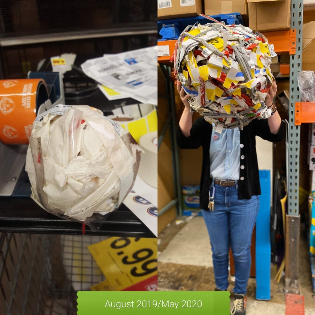 In the mush news today we pay homage to the tape ball that grew back in August of 2019. Sigh..Okay.. I spend a good amount of my day fixing signs that have fallen off on the floor the previous night. Some go missing (I know it’s you El Diablo..you and SeΓ±or Trashcan take them and throw them away!!! Baaaahh), so I started using duck tape despite the rules. I started saving the tape I tear off my plastic sign holders (got to reduce, reuse, and recycle) and Bigbsy III came to life (there were two previous attempts at a tape ball but they went missing).