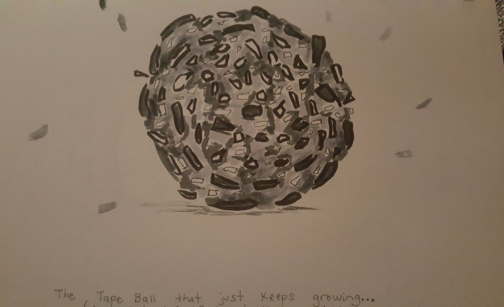 Here’s to you Bigbsy III! May you grow to ever more enormous girths! You’ve lifted my spirits in a way only a massive tape ball could! I’ll drink ye a bottle of wine for ye!