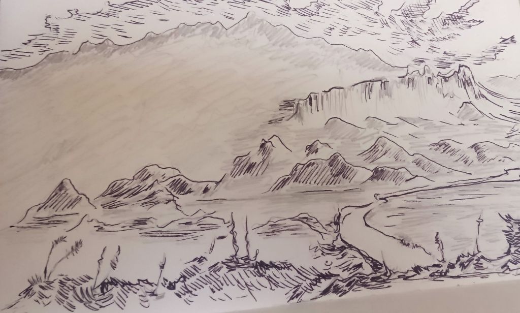 And a half finished, I guess, doodle of some mountains. I have been wanting to take a trip out to Big Bend. I haven’t been since I was a kid. I want to know what fascinated my dad about the place, as I only remember mere glimpses of the mountains. I do love them so! And we were very close to Big Bend a couple of years ago in the Davis mountains. So yeah, the mountains be calling me!!