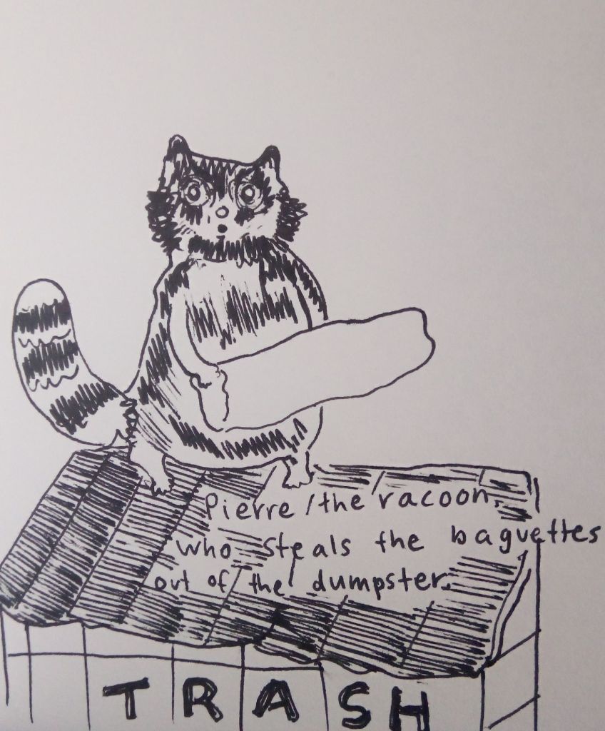 On multiple occasions I’ve caught a raccoon climbing out of a tree to steal baguettes out of the dumpster. Sometimes full, sometimes half loaves of baguettes. I’m almost convinced someone is purposely leaving them for him! So we named him Pierre, he has exquisite taste. As all French do…I’m going to leave him a glass of bourdeux next time.