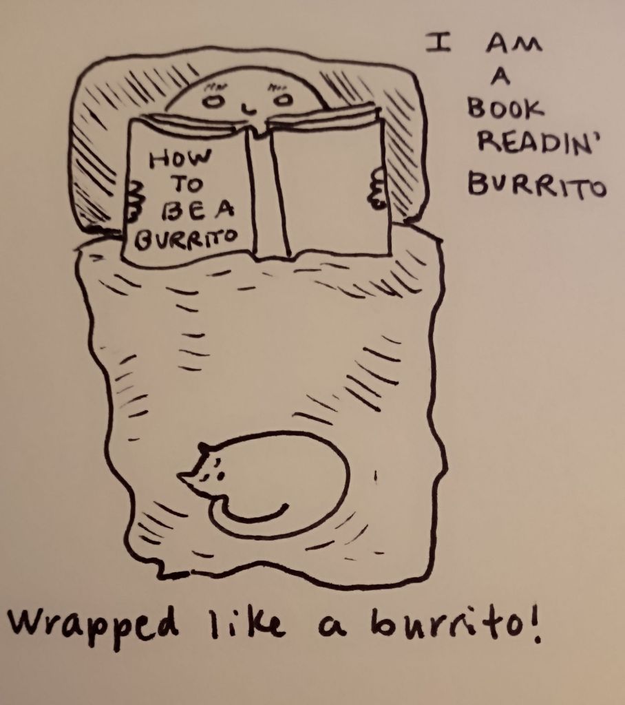 Seems like the only acceptable occupation in winter time…being a blanket burrito. And book in hand, cozy kitty on my legs, I see no other way to occupy my time with. Good day to you all.