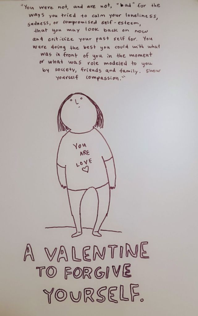 A fresh off the old mush block, a brand new kind of Valentine. One I created for myself but may resonate with anyone dealing with loving yourself or forgiving yourself. I don’t know who wrote the quote so forgive me, I must not take credit for it. But I think when I read it, “oh yeah I punish myself all the time for the things I have done.” But there was a lesson in all of it. It weighs heavy sometimes.